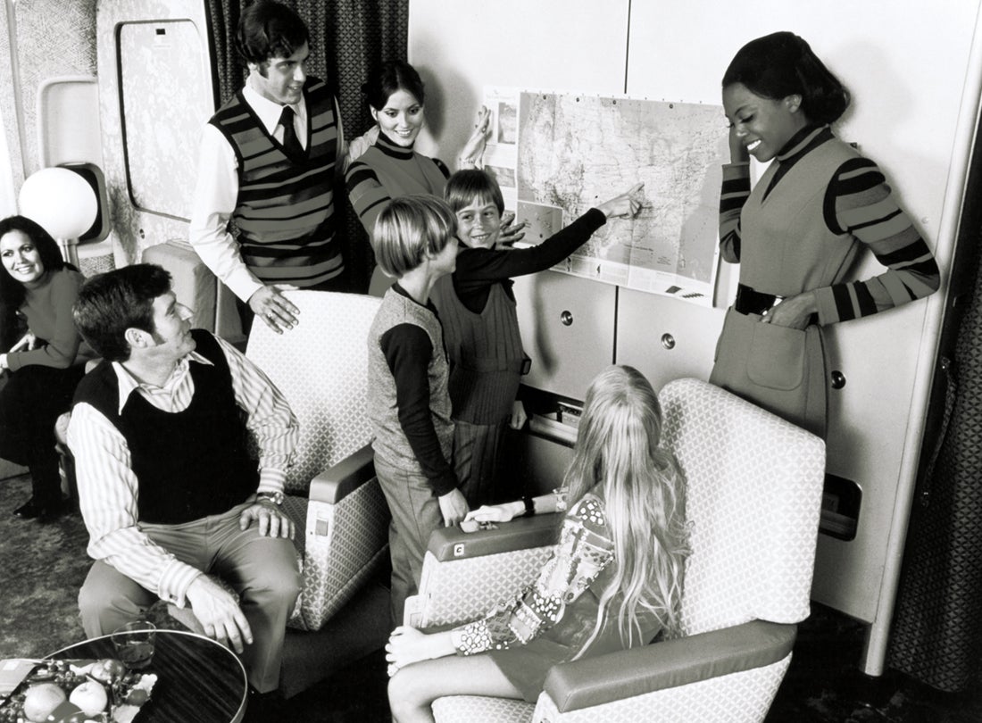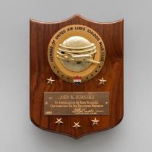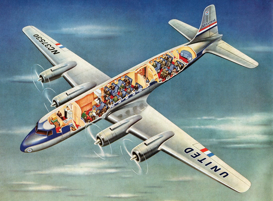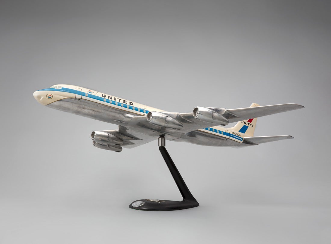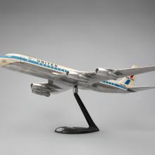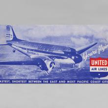 United Air Lines introduced hot meal service on Douglas DST (Douglas Sleeper Transport) and DC-3 flights in the late 1930s. The DC-3 was one of the first airliners to be equipped with a galley. Meals on short, daytime flights were served with paper or plastic cups and plates to reduce weight. Lightweight plastic cups, saucers, and plates were produced by Hemco Plastics and Plastics, Inc., while paper cups were made of sturdy “Nestrite” by the Lily-Tulip Cup Company of New York. Ceramic wares were specifically designed to be light, yet sturdy, for inflight use. Plates were produced by the Shenango China Company of New Castle, Pennsylvania, while casserole dishes were manufactured by Hall China of East Liverpool, Ohio. Silver-plated flatware was offered with most types of meal service. One set featured the same “Embossed” art deco pattern incorporated on the airline’s blue plastic dishes.