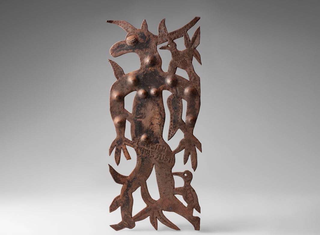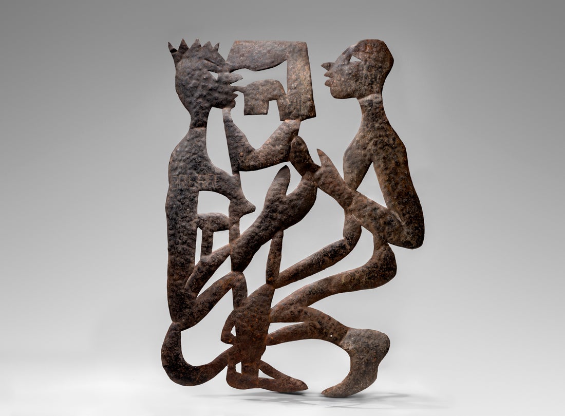 Murat Brièrre (1938–88) served in various trades, including as a blacksmith, prior to becoming an artist. He met renowned Haitian painter Rigaud Benoit (1911–86) who encouraged Brièrre to paint and introduced him to Le Centre d’Art in Port-au-Prince in 1956 where Brièrre studied drawing and painting. Brièrre decided to shift gears in the mid-1960s and instead focused on metalwork. He was the first to study under Georges Liautaud (1899–1991), and he quickly gained recognition as one of the preeminent metal sculptors of Haiti. Brièrre premiered new themes, such as sunbursts with facial expressions and pregnant women carrying babies in their bellies. Fantastical creatures and figures linked together to form narratives comprise some of his highly imaginative, distinctive work. Like other Haitian artists, much of his sculpture displays elements of Haitian Vodou. Brièrre’s metalwork has been exhibited in France and the United States among other countries and is held in the permanent collections of museums, such as Le Centre d’Art in Port-au-Prince, the Waterloo Center for the Arts in Waterloo, Iowa, and the Milwaukee Art Museum.