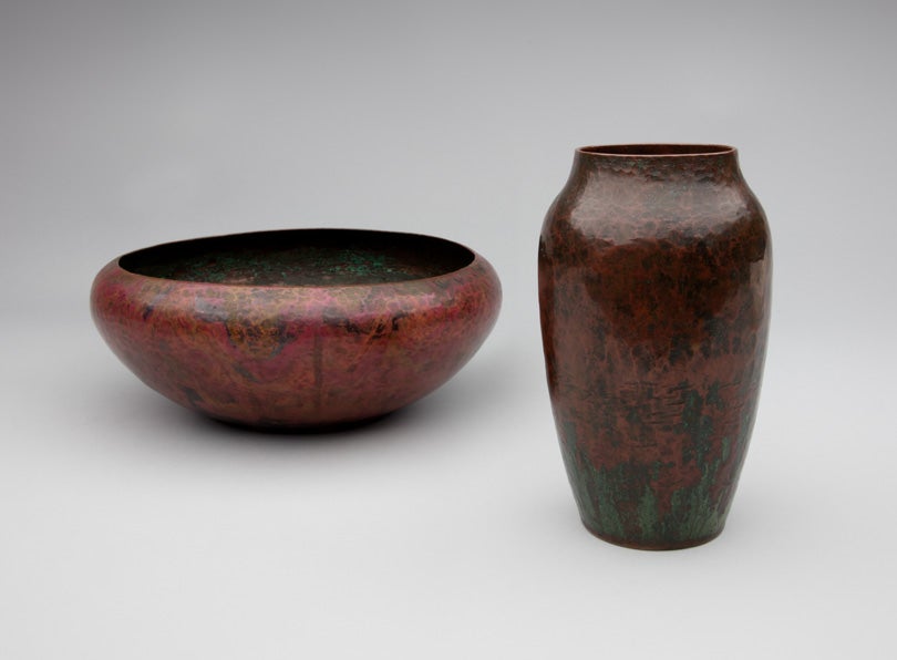 Master craftsman Dirk van Erp (1862–1933) immigrated to the United States from the Netherlands in 1890. He soon settled in San Francisco where he worked for the Union Iron Works. Later on, he worked as a coppersmith in Vallejo at the Mare Island Naval Shipyard. During his free time, he began crafting vases using artillery shell casings. Within a couple of years he started selling them to an art gallery in San Francisco. In 1907, van Erp left the shipyard and was working full-time on his copper work. He later opened the Art Copper Shop in Oakland before leaving to form a new partnership in San Francisco in the fall of 1909 with the metalworker Elizabeth Eleanor D’Arcy Gaw (1868–1944). In 1910, the two designed the Dutch windmill mark that identified their work. Although the partners disbanded in 1911, Gaw left a lasting influence on van Erp’s work.