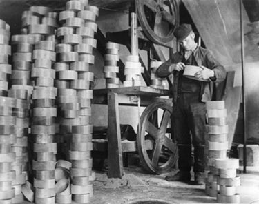 Brother Delmer Wilson in his shop in front of a bandsaw c. 1910