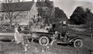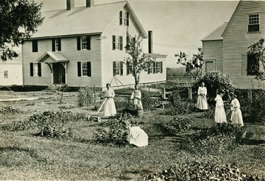 Shaker girls working in the garden near the ministry shop and meeting house c.1915