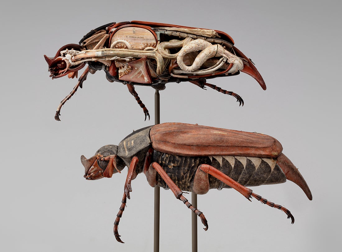 The cockchafer beetle (Melolontha melolontha Linnaeus, 1758) is a well-known plant pest in Europe, and one of the first beetle species named by Carl von Linné (a.k.a. Linnaeus), the Swedish biologist who created the binomial system for naming species. This papier-mâché model was made by the manufactory of French surgeon Dr. Louis Auzoux in 1881 as a teaching tool for entomology students. All of the internal and external organs are labeled with their proper names in a style he called anatomie clastique (“broken in pieces”). Auzoux created similar models of humans, horses, and other animals.