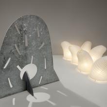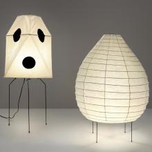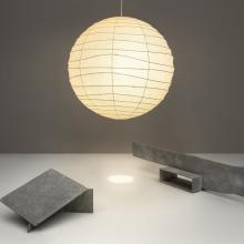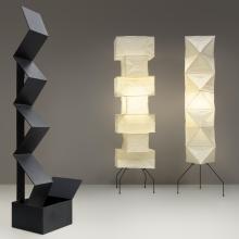 The exhibition’s two installations represent interior and exterior landscapes. The objects are drawn from Noguchi's last two forays in sheet metal kirigami, combined with his most successful and ubiquitous expansion of the practice of sculpture, his electrified paper-and-bamboo Akari lanterns. The galvanized steel pieces in the exterior environment, made from the same material as guardrails and lampposts, were conceived as a series of editions to answer the great demand for outdoor sculpture by him with works that are, like Akari, relatively lightweight, inexpensive, playful, and unpretentious. In the interior environment, Akari lanterns join a related body of work in cut-and-folded bronze plate designed to winkingly play off of the perceived preciousness and self-seriousness of bronze sculpture.