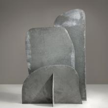 From the time he left Brancusi’s studio in 1927 until his death in 1988, Noguchi regularly returned to flat materials for his sculpture: sheet brass in the late 1920s; surplus sheets of architectural marble cladding in the 1940s; sheet aluminum, slabs of clay for non-functional ceramics, and washi paper for Akari lanterns beginning in the 1950s; stainless steel in the 1960s and 70s; and steel and bronze plate in the 1980s.