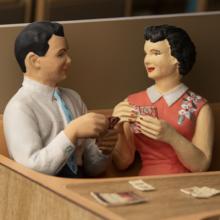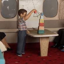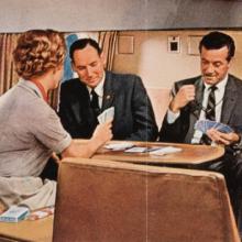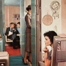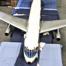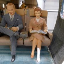 Created to be an easily viewable, three-dimensional presentation of the Jet Mainliner in miniature, the cutaway model contains a highly detailed cockpit and cabin interior with minute features that accurately replicate the actual United DC-8 as launched in 1959. These include carpets, seats, bulkheads, curtains, murals, and tables, all in colors, patterns, and configurations similar to those in renowned industrial designer Raymond Loewy’s (1893–1986) original interior conception. It is populated with figurines of pilots in the cockpit and stewardesses in the cabin. Passenger figurines are situated throughout the interior conducting numerous activities. This exhibition presents this unique cutaway model, along with DC-8 historical photographs and promotional materials, and video segments from United’s promotional film Jet Mainliner Flight 803. Also presented is the conservation work performed by SFO Museum staff to restore the model for viewing.