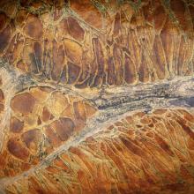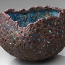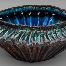 Electroforming was unpredictable and coated her pieces with dramatic surface detail, accentuating rims and edges with encrusted formations. Schwarcz incorporated a variety of finishes into her vessel forms, both inside and out. She layered vivid, multicolored enamels in multiple kiln firings, at times sandblasting the exterior to contrast with the interior. Schwarcz employed plique-à-jour, French for “letting in light,” by laying transparent enamels over pierced windows. Chemical patinas and iron plating lent a raw look to some of her pieces; gold and silver plating made others shine like jewelry. When not finishing the exterior, she welcomed the oxidation that heat from the kiln left on bare copper plating. This exhibition presents a retrospective of Schwarcz’s enameled art from the extensive collection of Forrest L. Merrill.