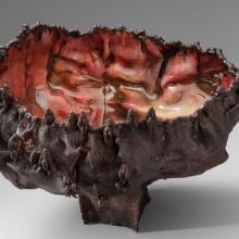 June Schwarcz (1918–2015) made unconventional enameled art that pushed the boundaries of her craft for more than sixty years. Inspired by nature, fashion, and abstract, African, and Asian art, Schwarcz developed unique metalworking techniques, always experimenting and embracing complex technical challenges. She initially worked with copper panels and spun-copper bowls, infusing them with her own interpretation of traditional enameling. During the 1960s, Schwarcz pioneered electroforming, an innovative method that involved electroplating pieces made from thin copper foil. Schwarcz focused on sculptural vessels and when asked about her abstract forms, she explained, “they simply don’t hold water.”