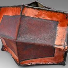 In the early 1960s, Schwarcz’s husband Leroy, a mechanical engineer, constructed an electroplating tank so she could plate raised designs to fill with champlevé and cloisonné enamels. Schwarcz was also fascinated by textiles, and she maintained lifelong friendships with Bay Area fiber artists Lillian Elliott (1930–94) and Kay Sekimachi (b. 1926). Based on her experiments with electroplating and her knowledge of textiles, Schwarcz developed a remarkable method for electroforming vessels. After finalizing a pattern in paper, she crafted the shape from thin copper foil by cutting, folding, gathering, and stitching with copper wire—almost treating the material like fabric. Schwarcz then submerged the form in her electroplating tank, which deposited a layer of metal that strengthened the vessel. In later years, Schwarcz substituted copper screen for foil, drawn to the screen for its lighter weight and fabric-like qualities.