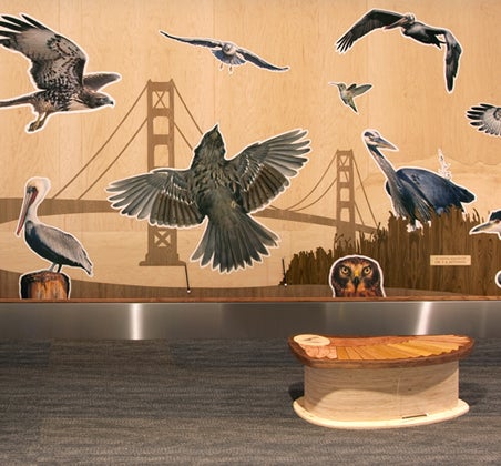San Francisco Bay Area Bird Encounters is an interactive children’s play area featuring work by artist Walter Kitundu. The handmade mural and benches feature local birds such as Red-tailed Hawks, Anna’s Hummingbirds, herons, egrets, and others found throughout the Bay Area. The birds, which are printed on wood and inlaid into the mural, are derived from photographs by the artist. At the mural’s center is a large Golden-crowned Sparrow whose wings double as a musical instrument. The wing feathers are xylophone tines tuned to the notes of the sparrows’ song. The benches, in the shape of wings, are also xylophone tines tuned to the sparrows’ song.