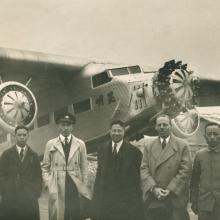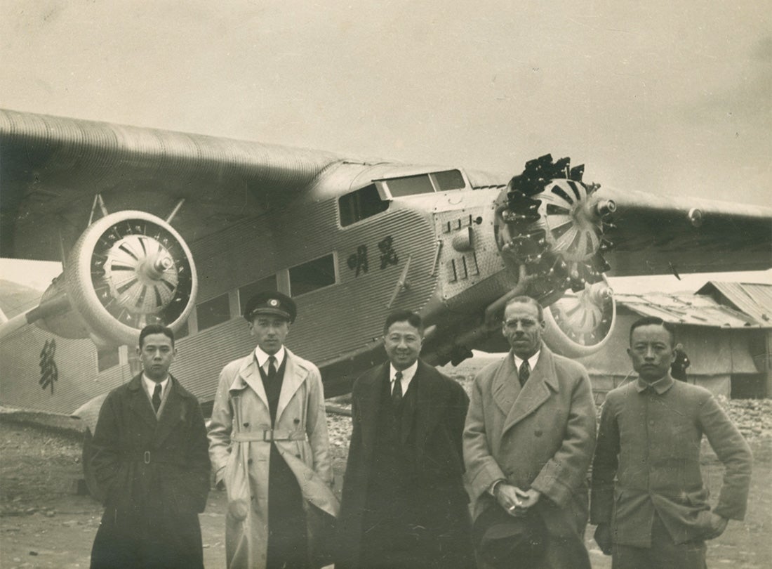 (from left) CNAC Radio Operator Joe Loh, Captain Donald S. Wong, Director Ki Chun, Pan American Airways Far Eastern representative Harold M. Bixby, and Assistant Operations Manager K. I. Nieh and Ford Tri-Motor 1937