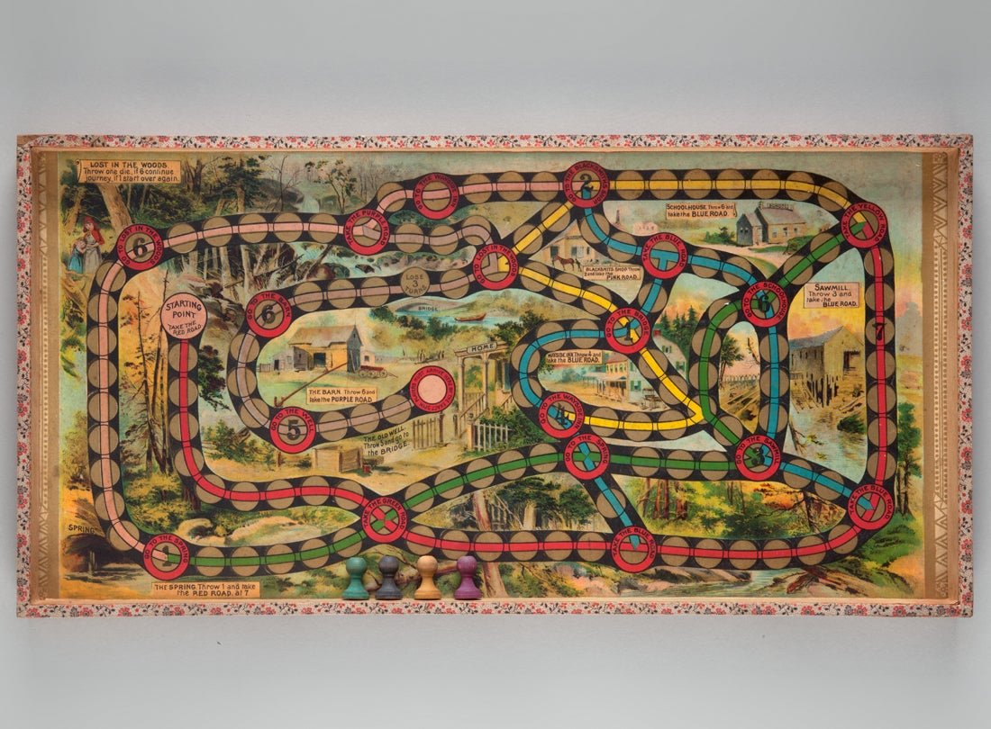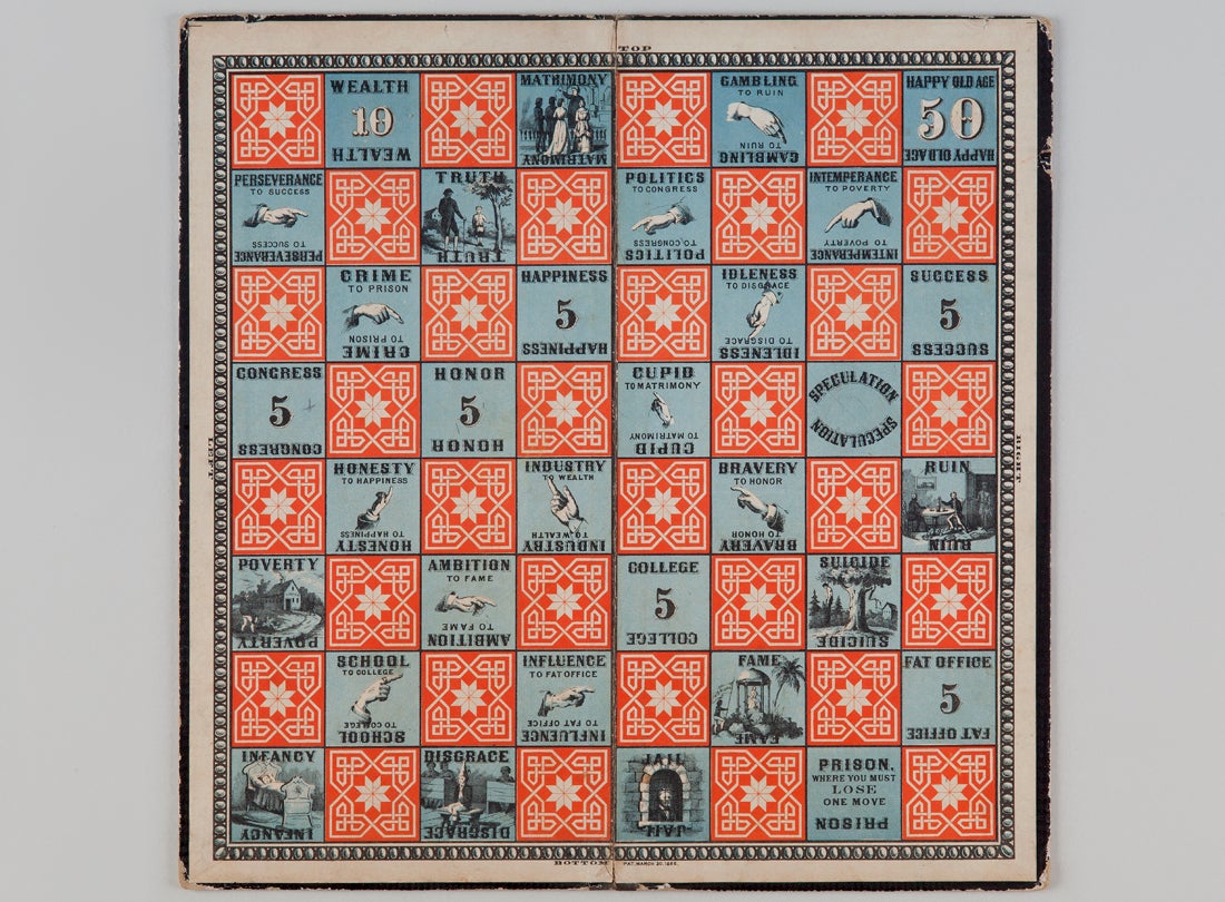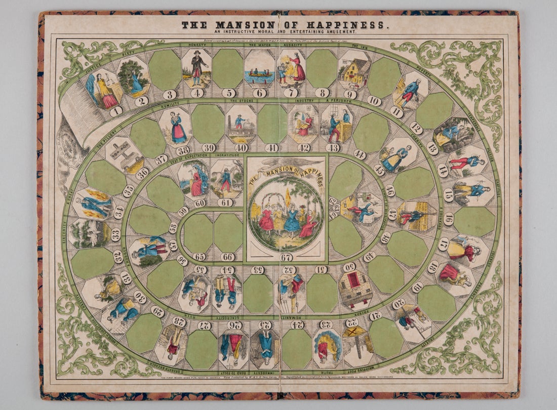This is a Parker Brothers’ 1894 reissue of the original Mansion of Happiness released by W. & S. B. Ives in the 1840s. Perhaps the earliest American board game to be mass-produced, it advocates simple, moralistic themes. Idleness leads to poverty and the Sabbath breaker goes straight to the whipping post. In contrast, landing on squares marked piety, chastity, and humility, advances players along the path towards the Mansion of Happiness. Reinforcing moral values was the predominant theme of early board games. These educational games reminded players of the destruction that results from vice and the rewards reaped from living a virtuous life.