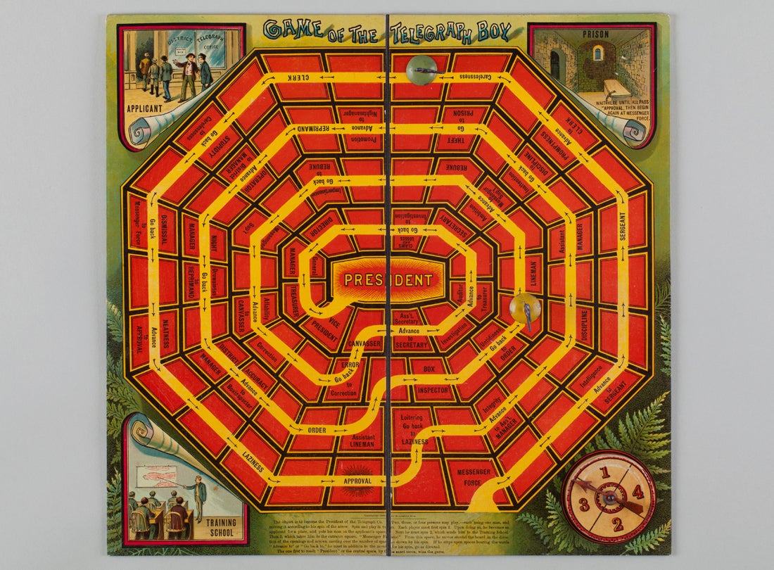 Game of the Telegraph Boy was one of many games from the 1880s that depicted the American capitalist dream of Horatio Alger’s novels. In many of his novels, young men rise from rags-to-riches and are rewarded in the workplace based on merit, regardless of their humble backgrounds. The goal of this game is for each player to work one’s way up from low-level employee to company president.