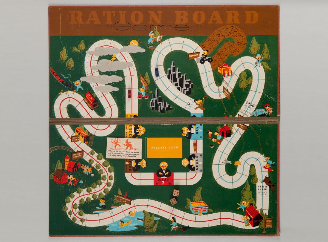 This game promoted the rationing of goods during World War II. During the war, rations of common goods were available through the use of government issued cards and booklets, controlled by the ration board. The game board illustration depicts a road winding through the countryside and suburbs into a city where the ration boards are stationed. The first player who returns home with five ration cards for butter, gas, sugar, coffee, and meat wins.
