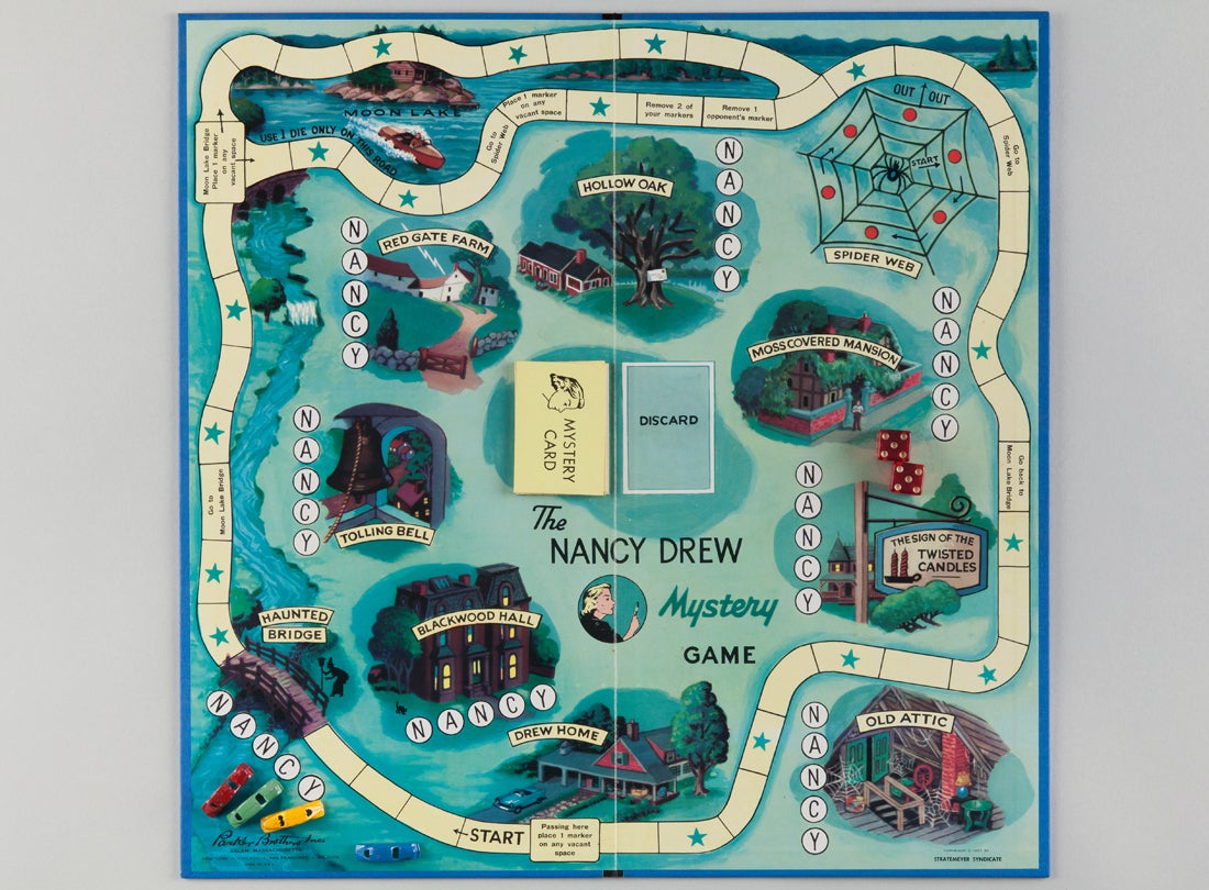 Mysteries have continuously enthralled a variety of audiences, from detective fiction to television and films. Mystery and detective games first began to appear in the late 1800s and enjoyed a golden era in the 1930s. The teen-sleuth Nancy Drew first appeared in a series of books during this decade. The object of this game is to be the first player to discover Nancy Drew’s whereabouts.