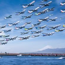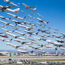 At any given moment, there are at least seven thousand commercial airplanes in the sky. In 2016, commercial flights carried between three and four billion passengers to destinations throughout the world. These traffic numbers might feel surprising given the sense of solitude and boundless space one encounters when peering out of an airplane window at cruising altitude, but the skies are busier than they seem. In his series Airportraits, photographer Mike Kelley offers a glimpse into the often overlooked volume of the world’s air traffic.