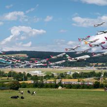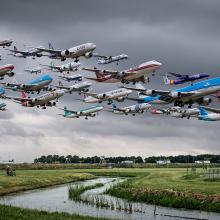 Kelley travels to airports throughout the globe, looking for scenes that accurately describe the landscape while providing a vantage point from which the airport’s traffic can be seen in a linear trajectory. Unlike most photographs that represent a decisive moment in time, each image in this series is made over the course of many hours. Upon finding an angle with an unobstructed view, he uses a stationary camera to capture every aircraft movement over the course of a set period; such as ten hours of traffic at Tokyo Haneda Airport. Once back at his studio, Kelley layers every airplane photographed onto a background image to create a temporally expanded composite of the airport and its movement.