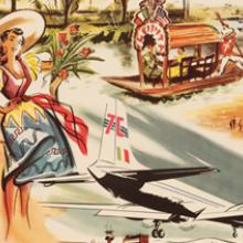 By the late 1940s, land-based, piston-engine airliners including the Boeing 377 Stratocruiser and Douglas DC-4 significantly decreased travel times and ticket prices—making the clipper flying boats obsolete. However, over the next few decades Pan American World Airways continued to name their flagship airliners in the clipper tradition with such romantic names as Clipper Golden Gate, Clipper Freedom, and many others. Daily “Round-the-World” flights departed San Francisco, Los Angeles, and New York to more than eighty countries and territories. A milestone occurred on October 26, 1958, when Pan American inaugurated the world’s first transatlantic jet service with a flight from New York to Paris on the revolutionary Boeing 707, Clipper America. Soon thereafter, Pan American jets departed San Francisco International Airport and others for worldwide destinations on a regular basis. This exhibition features posters from the 1950s that reflect five continents of Pan American World Airways service.