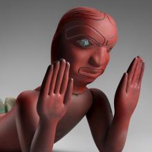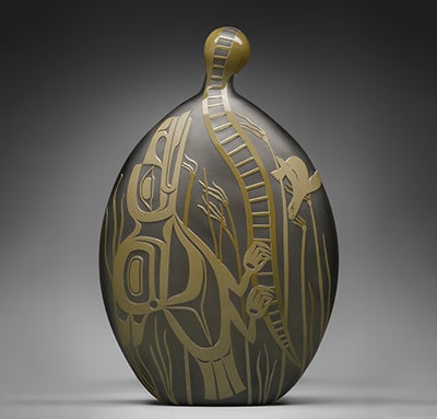 Preston Singletary (b. 1963) combines imagery, forms, and storytelling from his Tlingit heritage and culture with modern studio glass—fusing Indigenous traditions with contemporary art. By reinterpreting Tlingit design and mythology, Singletary’s work is both inspiring and cautionary, reminding us of humankind’s place in the world and the consequences of modernization on our cultures and the environment. Singletary also validates the significance of Indigenous art: “my work challenges the notion that Native artists must only use traditional materials. By embracing glass as a storytelling medium, I seek to affirm our presence and identity, reinforcing that Indigenous cultures are dynamic, evolving, and rooted in resilience.”