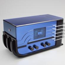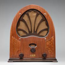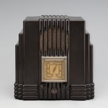 Between 1922 and 1924, the number of radio stations in the United States skyrocketed from twenty-eight to more than 1,400. Stations broadcast to amplified receivers and loudspeakers, and radios that ran on household electricity replaced cumbersome, battery-operated sets. By the 1930s, a new series of compact, high-powered radios incorporated improved vacuum tubes and circuitry. Modern materials such as plastics and molded plywood introduced Art Deco and industrial design to radio styling, and manufacturers advertised “a radio for every room.” This was the golden age of broadcasting, characterized by radio shows performed by actors, sound engineers, and live musicians.