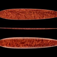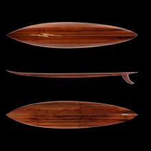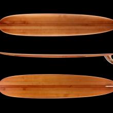 After Fuller located sawyer and wood collector Charles Pyle (b. 1945), they created a series of surfboards with Takayama from old-growth redwood salvaged from the 1854 Mirassou Winery in Northern California. This wine-tank redwood was carefully selected, sawed to shape, arranged into book-matched strips, and temporarily glued together to create laminated surfboard blanks. A computer numerically controlled (CNC) machine then cut the blanks to the profile of an original master surfboard. Once back with Fuller, the boards were broken apart and each strip was hollowed-out with a router. Final assemblies were permanently glued together and transferred to Takayama for final shaping, followed by fiberglassing, fin installation, and finish work.