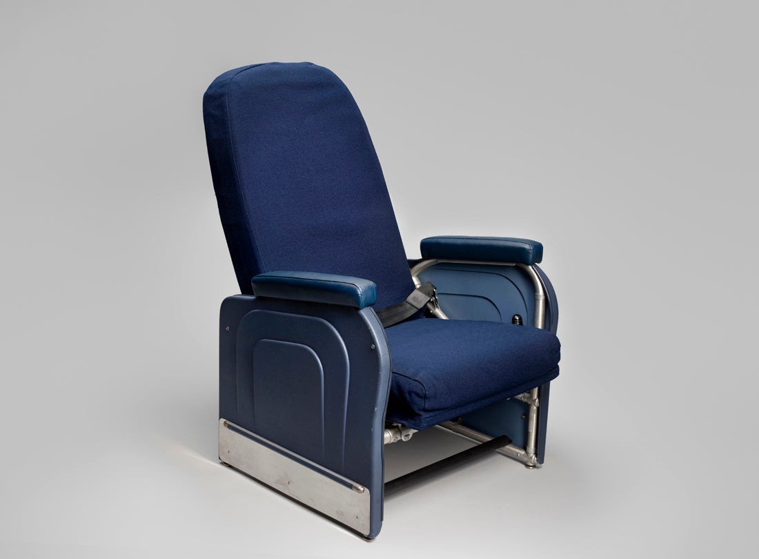 This Douglas DC-3 seat was typically used in the day-use configuration. It is covered in fabric, amply cushioned, and represents the introduction of foam rubber on airliner seats. First created by Dunlop Rubber in 1929, foam rubber was used in many cushioning products by the late 1930s. The Firestone Tire and Rubber Company promoted its Foamex brand by claiming “nothing cuts flying fatigue like Foamex” and promising “resilience and softness in one zephyr-light material.” The seat is framed in aluminum tubing and features a spring-loaded pivot mechanism that simultaneously slides the seat forward while allowing the back to recline to thirty degrees from the normal upright setting of fifteen degrees. The chair also has plastic sidewalls giving it a clean, streamlined look. Some chairs aboard the DC-3 included holders under the seat for round paper cartons, commonly called burp cups, in case of motion sickness. Washable linen covers, known as antimacassars, were often fitted over the headrest to prevent hair oil from soiling the fabric. For extra comfort, airlines also offered passengers pillows and blankets.