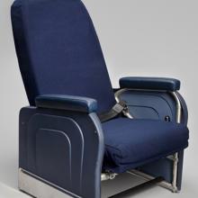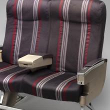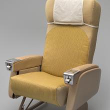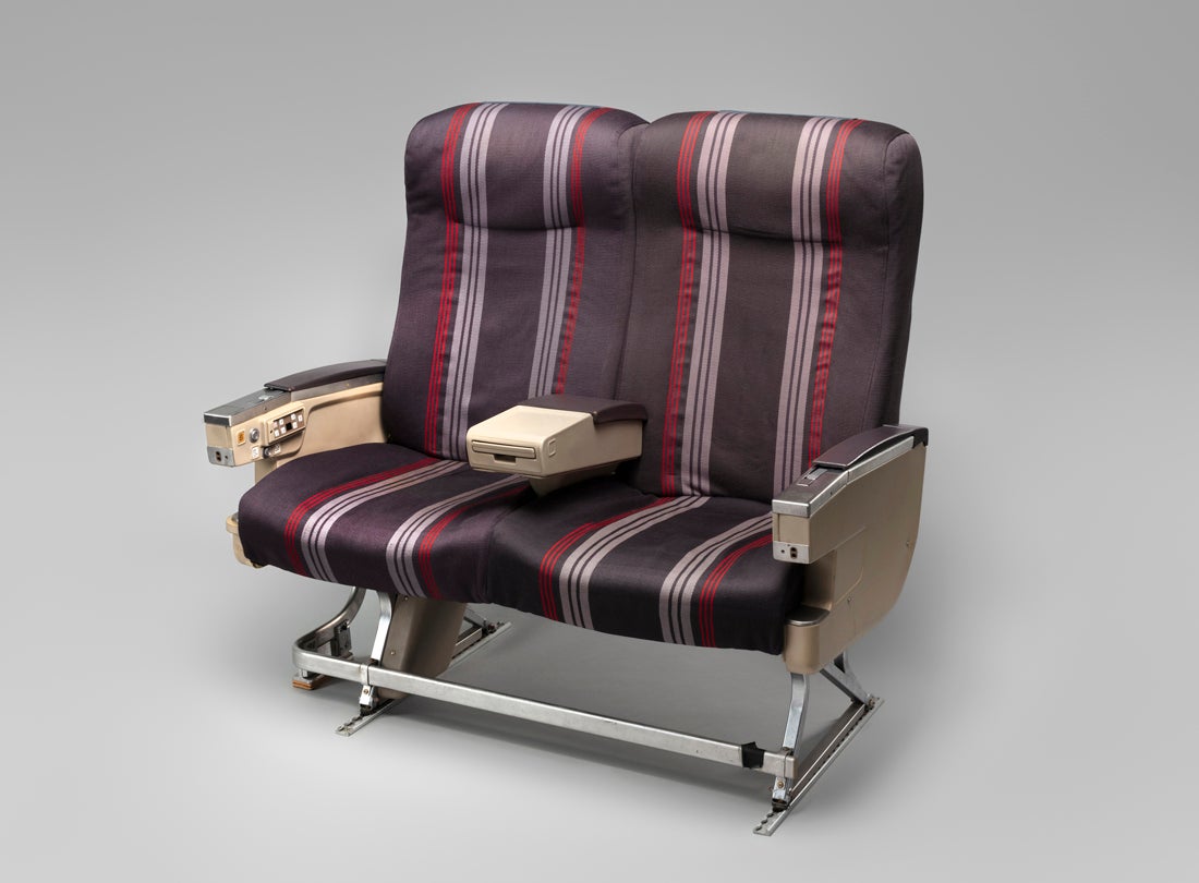 These seats were initially installed in the first-class cabin of a United Air Lines 747-100 that launched into service in 1970. They feature thick foam cushioning housed in a lightweight, heavy duty aluminum frame with plastic exterior covers. The armrests feature ashtrays, pushbutton recline and foot rest extension (not shown) mechanisms, an audio entertainment remote control unit with station selection and volume control buttons, pneumatic headphone ports, and hideaway tray tables. In place of a middle armrest each two-seat section had a small, extendable tray. Around 1990, United reupholstered the seats in a dark-burgundy fabric with pewter and red stripes to match the color palette of a new business-class service branded as Connoisseur Class. It was promoted as offering one of the highest levels of international business-class service with gourmet meals designed by world-renowned chefs and highly-attentive cabin crews.