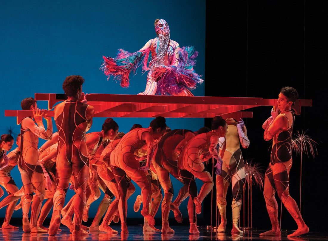 South-African-born Portuguese choreographer Arthur Pita’s (b. 1972) Björk Ballet celebrates the theatricality of Icelandic singer-songwriter Björk. Pita’s ballet is set to songs spanning Björk’s discography, from 1993’s Debut to 2017’s Utopia. In pondering a theme for San Francisco Ballet’s Unbound: A Festival of New Works (2018), Pita immediately thought of Björk: “The music is so theatrical—it’s big, but in a modern way,” explains Pita. “She’s this very playful, naughty fairy, dancing nymph, otherworldly creature, full of light and love,” he says. “And then you’ve got this very deep, mournful, sorrowful, almost tragedy in some of her songs.” Pita knew the music would drive the dancers and make them feel unbound, true to the festival’s theme. Throughout Björk Ballet, Pita’s choreography for its twenty-two dancers mixes kicks, lunges, and squats with classically inspired technique. In trying to capture Björk’s essence, Pita goes to extremes with his movement. There are cantilevered duets with an underwater quality and a classically based octet, set to “Frosti,” that Pita says, “should look like a ballerina music box on acid.” “Hyperballad,” Pita’s ballet rave, entails a long jumping sequence set to a pumping, driving rhythm. “It’s a metaphor—jumping for joy, jumping for love,” says Pita. Pita collaborated with Latino costume and fashion designer Marco Morante to create Björk Ballet’s stunning costumes. Morante’s costuming includes metallic, fringed body suits with geometric piping.