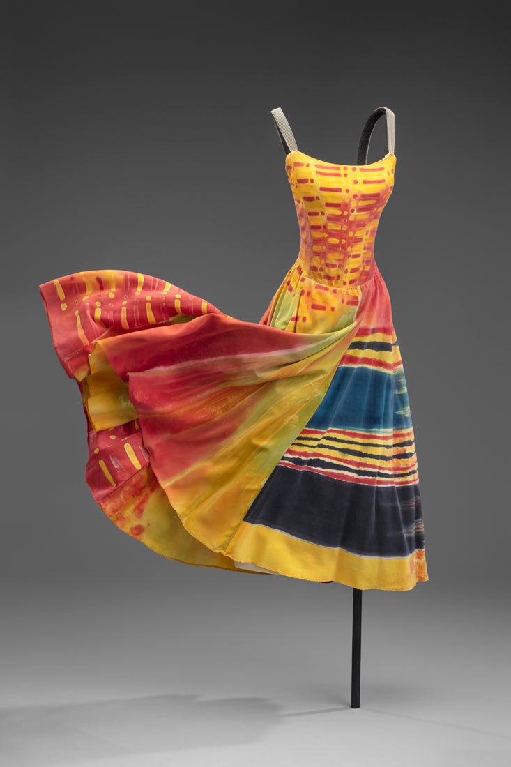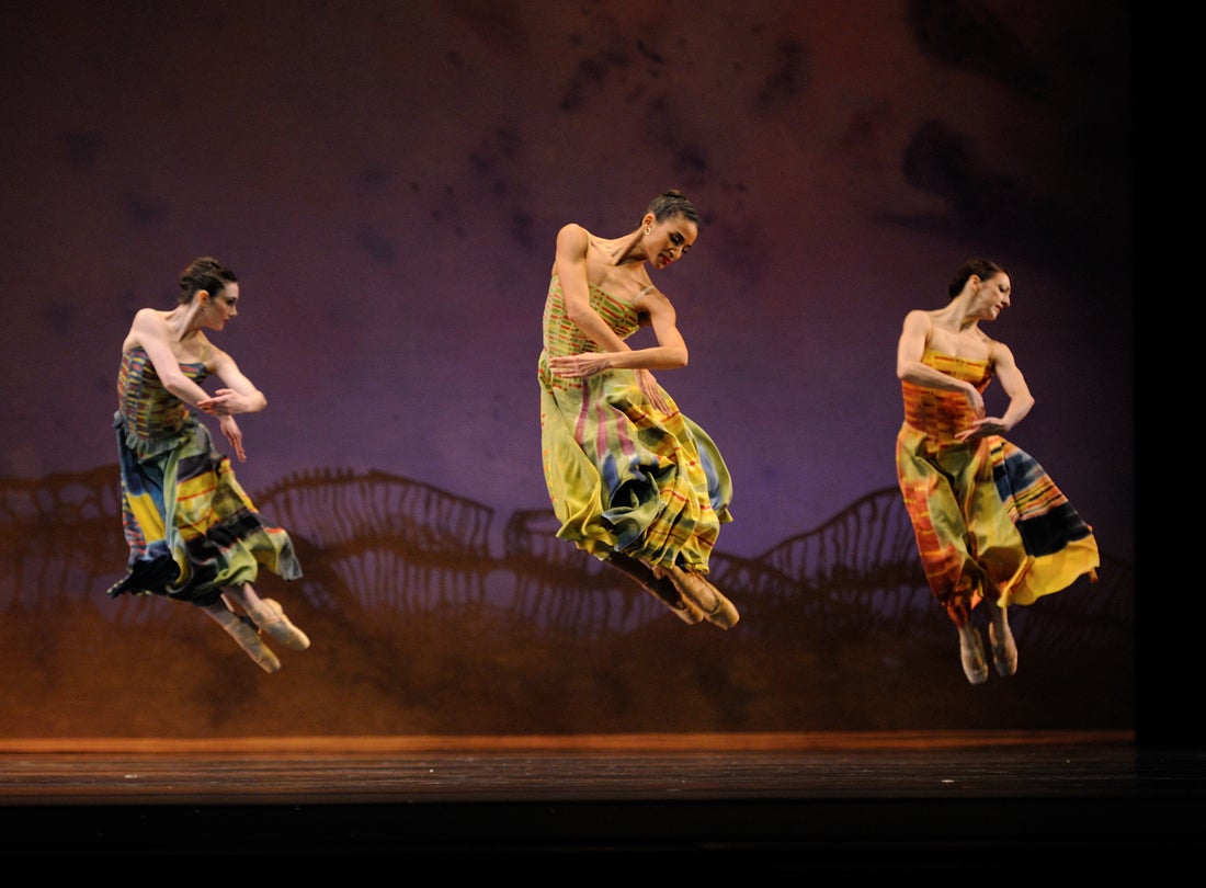 Oakland-born costume and set designer Sandra Woodall applied the same cultural fusion in her vibrant designs for the ballet. The costumes, though cut and tailored in a Western style, possess an African influence in their colors and patterns. For the women’s dresses, Woodall chose a silk satin material that she hand-painted, then turned the satin inward so the dancers would feel the movement of the fabric on their legs.