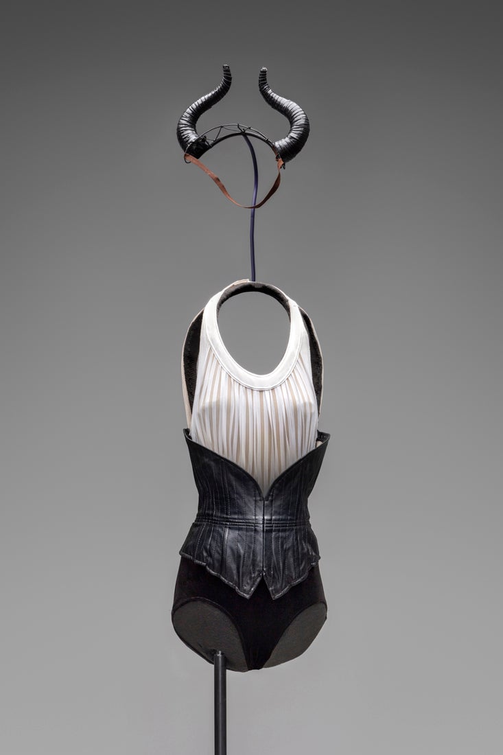 Guernica black-and-white halter leotard with leather corset and horned headpiece 2018