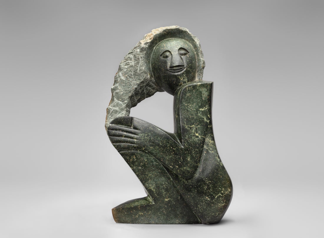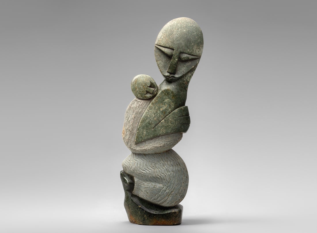 Pheoleen Gandari’s (b. 1979) interest in art began during grade school at Zengeza in Chitungwiza, a township in Harare. While in school, Gandari was inspired to carve stone by Newman Chikuni (b. 1956), a senior artist at the Chitungwiza Arts Centre whose work has been featured at the National Gallery in Harare. Gandari began assisting Chikuni on the weekends and was soon creating his own sculpture. Gandari shared a workshop with a fellow artist until joining the Chitungwiza Art Centre in 2001. Gandari tries to capture the emotion associated with daily life and events. His work appears in collections around the world, including UNESCO, where his sculpture is part of the United Nations Art Collection. In his sculpture, Kneeling Woman, Gandari skillfully leaves the hair unpolished to create a beautiful texture that contrasts with the body’s rich green sheen.