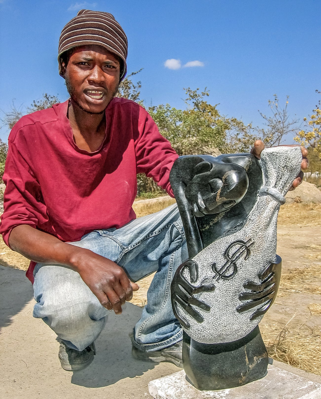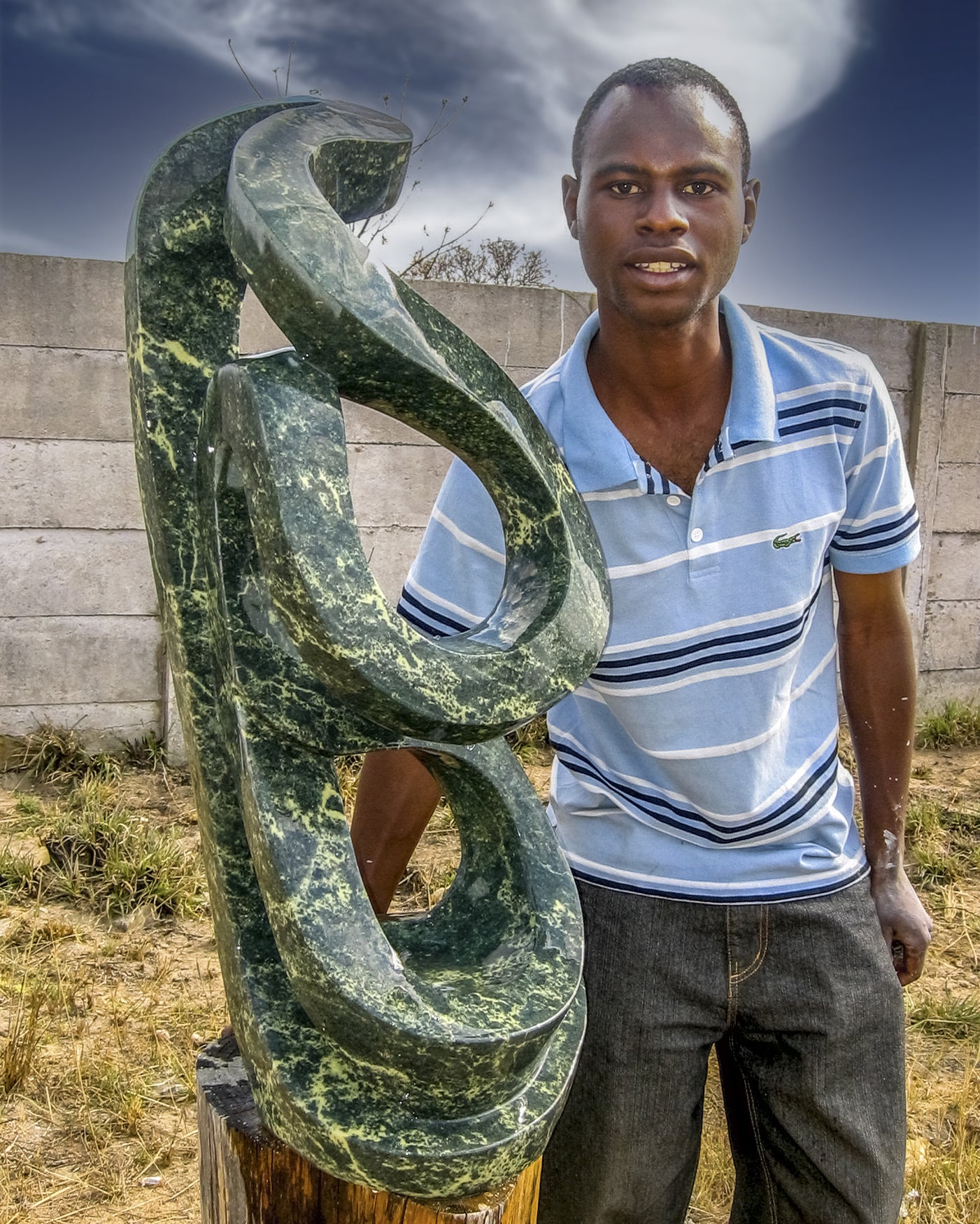 Born in Harare, Shona sculptor Wonder Mazhindu (b. 1982) learned to carve from his brother Picket Mazhindu Bumhira (b. 1968). After completing his education in 1999, he focused on stone carving and developed a distinctive style. Mazhindu enjoys working with harder types of stone, such as soapstone. He explains, “I am proud to be a Shona and that the art movement is enlightening the world on our myths and beliefs. The carving movement has grown to where we are now into the fifth generation of carvers…I am willing to teach others to carve. You [must] be very disciplined and love hard work and art. I never thought I would be an artist, but it is in our family. I believe I was born poor, but rich in mind, and I love my chosen path.” Mazhindu’s work has been exhibited in Germany, the United States, the Netherlands, the United Kingdom, China, South Korea, and Australia.