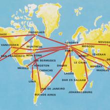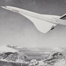 Air France and British Airways inflight items, such as menus, entertainment guides, flight packets, safety cards, and even matches were all created and branded for Concorde service. The airlines also distributed numerous specially designed souvenir Concorde gifts. For twenty-six years, Air France and British Airways flew scheduled Concorde service, until their supersonic fleet was retired in 2003. This exhibition presents press releases, promotional brochures, timetables, flight certificates, luggage tags, and other ephemera documenting Concorde’s development and service.