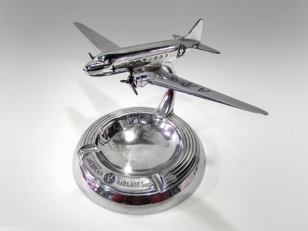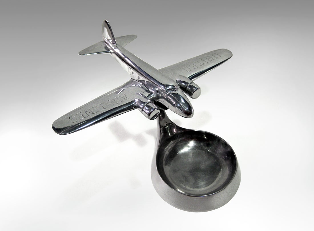 Modern airliner designs, beginning with the Boeing Model 247 and Douglas DC-2, introduced in 1933 and 1934, respectively, greatly advanced commercial aviation. The clean lines of sleek, aerodynamic fuselages were easily replicated in scale models that were elevated on round or teardrop bases. Usually crafted of chromed, die-cast metal, or polished aluminum, they projected the popular Streamline Moderne aesthetic in product design. The ashtray base could be cast as a single piece, fashioned separately in stone, or incorporated as a removable glass insert.
