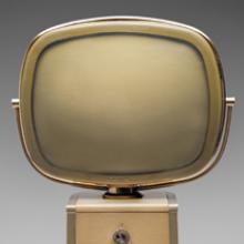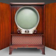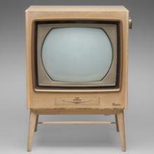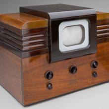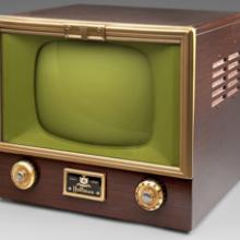 When Zenith entered the television market in the late 1940s, their sets' identifying feature was the "porthole" appearance that resulted from presenting the round picture tube without its customary rectangular mask. Zenith advertisements suggested that TV should naturally be round, "Like the pupil of the eye and the television camera lens itself…It employs the natural shape of the television tube face, to bring you a picture not only far larger than on ordinary receivers, but amazingly easier to view from any angle." The Tennyson was one in a series of Zenith's "Giant Circle" televisions in 1951, the final year of production for the "portholes" as consumers overwhelmingly preferred rectangular screens. The aluminum Zenith nameplate flipped down to reveal the television's control panel for fine-tuning, brightness, contrast, vertical and horizontal hold, and vertical size. A switch allowed the picture to be viewed in the 4:3 ratio, or one could adjust the height and width of the received picture to fill the screen.