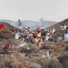 In his ongoing series, Emergent Behavior, artist Thomas Jackson creates suspended installations inspired by self-organizing, “emergent” systems found in nature such as schooling fish, swarming locusts, or flocking birds. Tapping into the fascination and uncanny feeling that these phenomena often evoke, Jackson’s hovering constructions utilize manufactured and mass-produced material—a stark contrast against the picturesque landscapes they inhabit. Working with a 4x5 film camera, Jackson creates large-scale photographs that meditate upon the complex relationship between the natural and the man-made, while inviting a fresh interpretation of everyday objects.