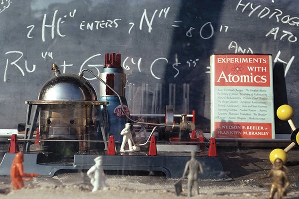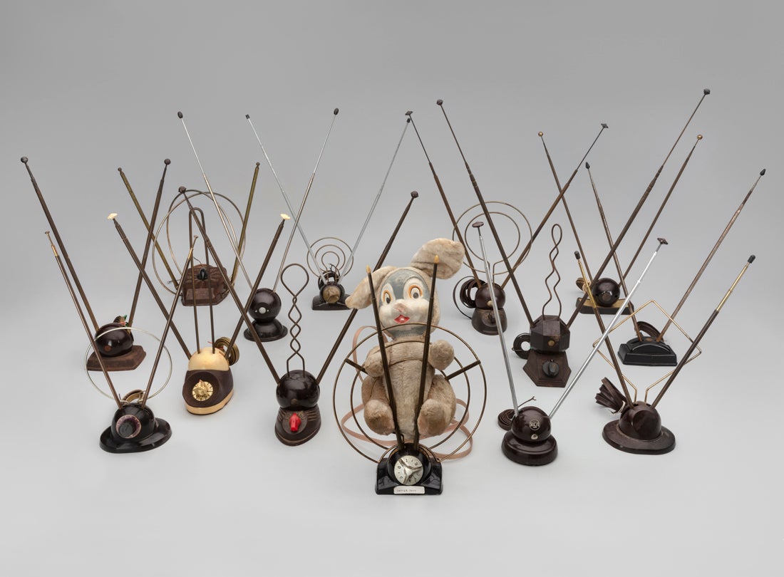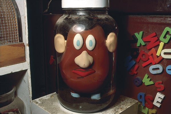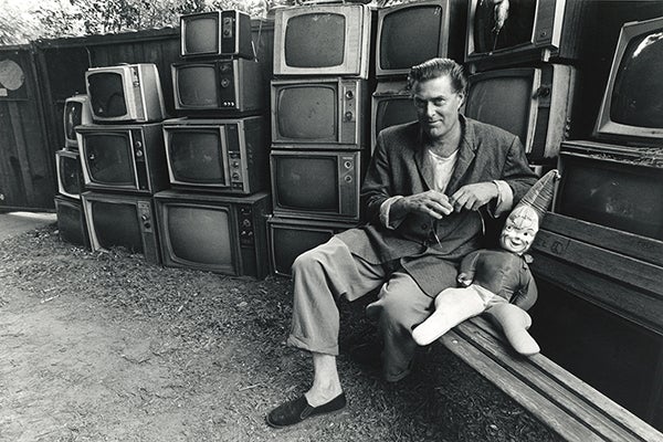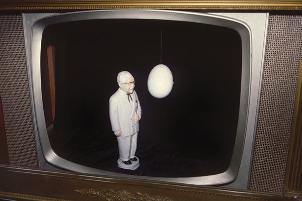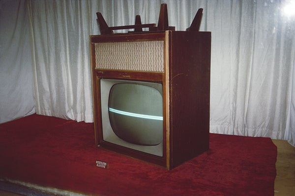The Unknown Museum has prominently featured the television. Mickey McGowan utilized hollowed-out sets as enclosures for many of his dioramas. He assembled stacks of televisions in various outdoor yard installations. At times, McGowan adjusted the signal of a working television placed in an indoor exhibit so all that appeared on the screen was a solitary horizontal line. He mixed jingles from early TV commercials onto audio tapes that played music and excerpts from movies, sitcoms, serials, and newscasts from the era. Audio volume rose and fell in a constant soundtrack; the “Perfect Moment” occurred when a direct connection was made—for example, if the Rice Krispies jingle randomly played while a visitor was looking at the ad characters Snap, Crackle, and Pop in the kitchen area of the museum.