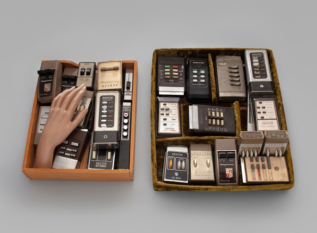 Artist, curator, and archivist Mickey McGowan (b. 1946) grew up in Los Angeles surrounded by experimental art and fashion, live beatnik jazz and rock ‘n’ roll music, surfing, hot rodding, and other elements of Southern California’s booming, pop-cultural scene. McGowan frequented Wallach’s Music City near Playa Del Rey and sampled the latest 45-rpm records. He watched William Castle movies such as House on Haunted Hill—complete with buzzing movie theatre seats and a “flying” skeleton—and underground films by Bruce Conner (1933–2008) and Andy Warhol (1928–87) at Hollywood’s Cinematheque 16. Even the city’s architecture was creative; McGowan recalled being “raised near buildings shaped like giant donuts and hot dogs—I assumed this was the way the world was!” He began collecting as a boy, nailing soda pop bottlecaps to a large, plywood board. McGowan pursued art more seriously in high school, beachcombing for scrap items that he painted and attached to boards as assemblages.