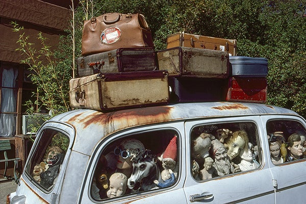 McGowan moved north of San Francisco to Sausalito in 1969, and during the 1970s he made hundreds of pairs of art shoes under the pseudonym Apple Cobbler. In 1973, he rented a former automotive repair shop in nearby Mill Valley as an art studio. One year later, McGowan began collaborating with artist-friend Dickens “44” Bascom (b. 1944), who was famous for his Decorated Car, a 1961 Ford Falcon that was “completely encrusted” in all manner of objects, from toys and tennis shoes to plastic fruit and typewriters. McGowan and Bascom opened the Unknown Museum the following year and invited other local “gluers,” now known as assemblage artists, including Lois Anderson (1927–2004), David Best (b. 1945), and Larry Fuente (b. 1947). By the end of the decade, Bascom moved overseas, and McGowan continued as “resident curator” of the Unknown Museum, a position he still holds today.