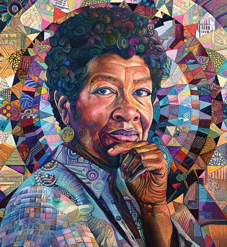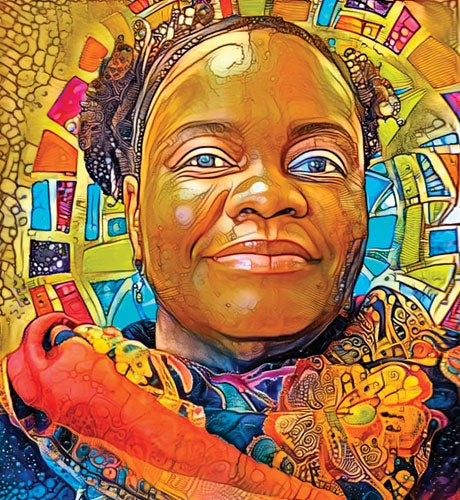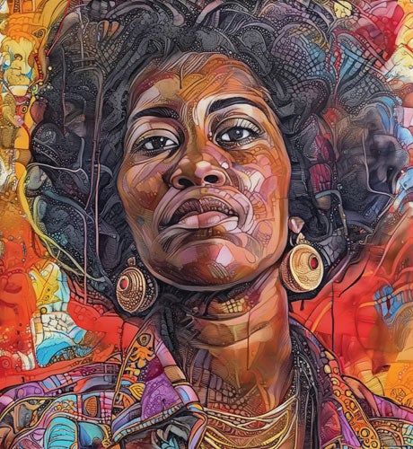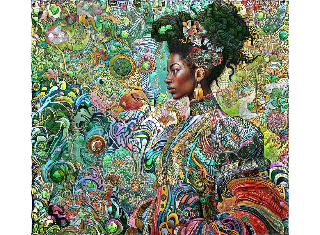 “Afrofuturism invites us to imagine new possibilities and futures, often by exploring alternative systems and technologies. This aligns with the potential of generative AI that encourages artists to take risks” explains Gaskins. “My work explores human imagination and software algorithms to produce visuals that open new possibilities for creative expression.” As an artist, she embeds her cultural background, art knowledge, and personal experiences into the tools and prompts she uses to generate images. Gaskins believes “what people misunderstand is how the current tools, in the hands of experienced digital artists, can be used to create new artworks...My intention is to go beyond what human hands can do.” In 2021, Gaskins exhibited a portrait series of eleven “Featured Futurists” as part of the Smithsonian’s Futures exhibition. Gaskins’ portraits of Greg Tate and Faith Ringgold have been displayed as outdoor murals at the Museum of Contemporary African Diasporan Arts in Brooklyn, New York.