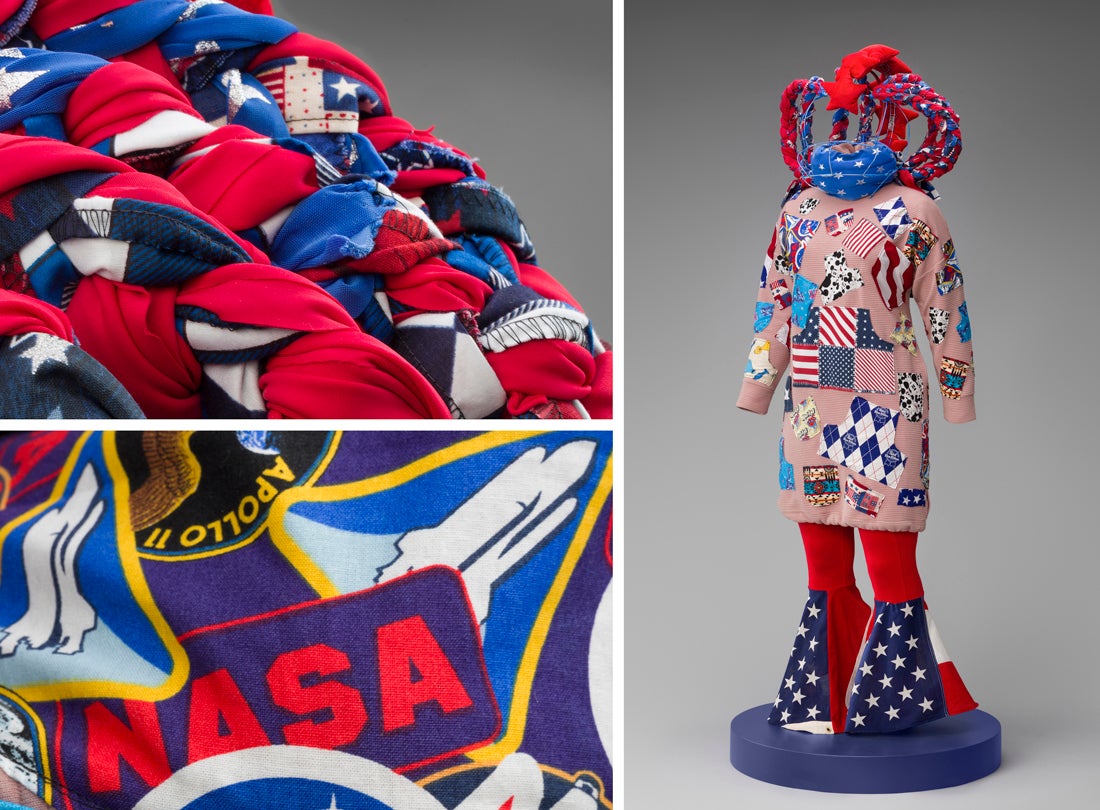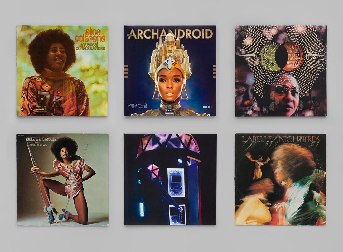 Peters also works in the medium of digital collage. The lenticular print she created for the exhibition contains three shifting frames and illustrates a powerful, vibrant “afronaut” in the future. The piece builds on a portrait of an unidentified African woman photographed in the early 1900s by an unknown photographer. The print reflects a point Peters once made about the cosmic, iconic nature of Blackness: “The creativity of Black people has the power to move the world.”