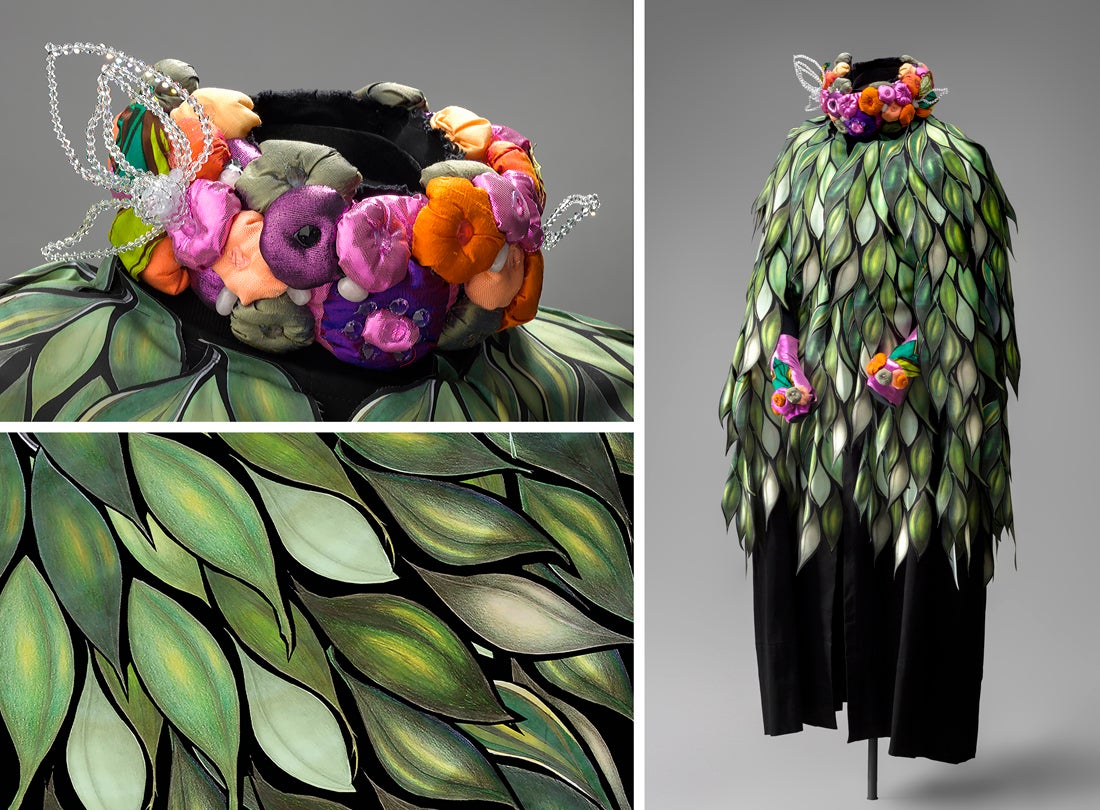 Denenge’s leaf drawings and portraits, developed as a National Endowment for the Humanities Fellow, led to the 2020 Camo Coat Collection, featured in the Victoria and Albert Museum’s Africa Fashion catalog (2022), among others. In 2023, the Museum of Fine Arts, Boston, acquired Denenge’s Hip Hop Flounce Coat for its permanent collection. The Osanyin Cape, part of this series, is inspired by camouflage in nature and the Yoruba orisa Osanyin, deity of healing and forest wisdom, often depicted as half tree, half human. The Camo Coat’s most recent iteration, CCv2: The Garden Collection, explores healing and protection through textiles and garments, inspired by Octavia Butler’s prophetic novel Parable of the Sower (1993). The story follows the young Lauren Oya Olamina who sets off on foot in 2024 across a dystopian California plagued by the disastrous effects of climate change, with the hope of establishing her new Earthseed community. This leaf garment serves as a stimulus to consider: How does one survive and thrive in the urban environment? How can we reimagine more sustainable and equitable futures for all?