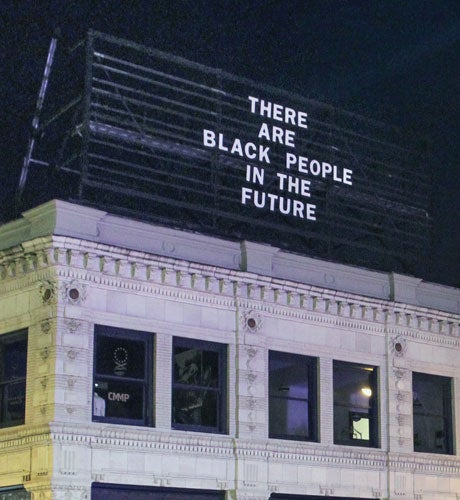 Based in Pittsburgh, Pennsylvania, interdisciplinary artist Alisha B. Wormsley imagines the future of art, science, and technology through a Black matriarchal lens. She creates works in a variety of mediums that challenge contemporary views of modern American society. Inspired by Afrofuturist artists and writers who champion the need for Black people to claim their place, Wormsley first developed her ongoing project, THERE ARE BLACK PEOPLE IN THE FUTURE, in 2012. She began writing the statement in sketchbooks, tagging it in various places, and stamping it onto artifacts collected from residents in Homewood, a Black community in Pittsburgh. Wormsley then preserved these items in resin for future generations. The project’s affirmation addresses the systemic oppression of Black communities through space and time and reaffirms the presence of Black people: past, present, and future. This statement has appeared in videos, installations, street art, and performances, and most famously, in 2017, when Wormsley placed the powerful words on a billboard in East Liberty, a neighborhood in Pittsburgh experiencing gentrification. Despite community protests, the billboard statement was removed by its owner. Since then, the billboard has been reproduced in Detroit, Charlotte, New York City, Kansas City, and Houston, and internationally in London, Accra, and Doha. THERE ARE BLACK PEOPLE IN THE FUTURE created a movement, and it continues to encourage dialogue and serve as a catalyst in support of Black futures.