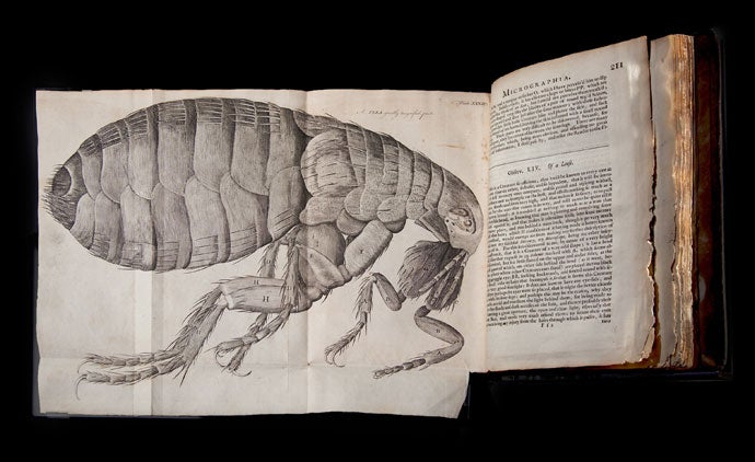Robert Hooke can arguably be called "England's Leonardo" in reference to the supremely multi-talented artist of the Italian Renaissance—Leonardo da Vinci. Hooke's areas of expertise included architecture, astronomy, biology, chemistry, geology, physics, and mathematics. As Curator of Experiments at the Royal Society of London, Hooke documented his microscopic observations in the 1665 publication, Micrographia: or some Physiological Descriptions of Minute Bodies Made by Magnifying Glasses. His vivid descriptions of objects ranging from ice crystals to a fly's eye were accompanied by Hooke's highly detailed and beautifully rendered copperplate engravings, some of which fold out to four times the size of the book. Hooke famously coined the biological use of the word "cell" while describing the structure of cork, which reminded him of a monk's quarters. His delight in discovering the "highest perfection" in all natural forms is evident in his wonderment at the mechanics of the lowly flea and "the beauty of it...all over adorn'd with a curiously polish'd suit of sable Armour, neatly jointed, and beset with multitudes of sharp pins, shap'd almost like Porcupine's Quills." Hooke's observations and illustrations inspired a multitude of other scientists at the dawn of the Age of Enlightenment to examine and reveal the secrets of a previously unseen microscopic world.