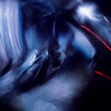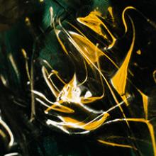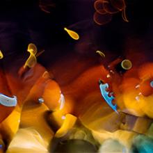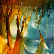 To make these images, Bullock produced an apparatus that held a number of horizontal sheets of clear glass spaced evenly above one another. Upon these, he would place a series of materials—water, shards of stained glass, brightly colored cellophane. By positioning the camera above and manipulating the materials on each layer of glass below, Bullock could precisely compose each frame to create his light abstractions. The resulting scenes were significant not only in their ability to transport the viewer to evocative worlds consisting solely of light and color, but in Bullock’s embrace of Kodachrome in his creative practice at a time when color photography was largely reserved for advertising and vernacular photography.