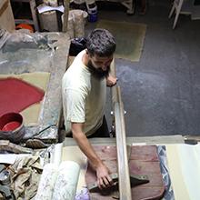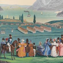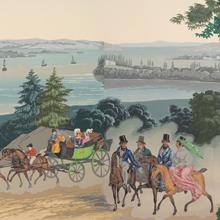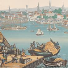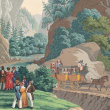 Jean Zuber (1773–1852) began working as a sales representative for a wallpaper firm at the age of seventeen in Mulhouse, France, before relocating the company to Rixheim, France, in 1797. By 1802, Zuber had become its sole owner, naming the firm Zuber et Cie. Zuber soon began producing panoramic papers and quickly gained prominence for his meticulous attention to detail and exquisite colors and designs. He worked closely with artists who generated full-scale panoramic compositions, which served as models for the hand-carved printing blocks. It requires anywhere from over one hundred to several thousand blocks to create a scenic paper set. Zuber et Cie’s artisans craft beautiful skies, which they carefully paint with large brushes before the rest of the imagery is block-printed by hand onto finely made paper.