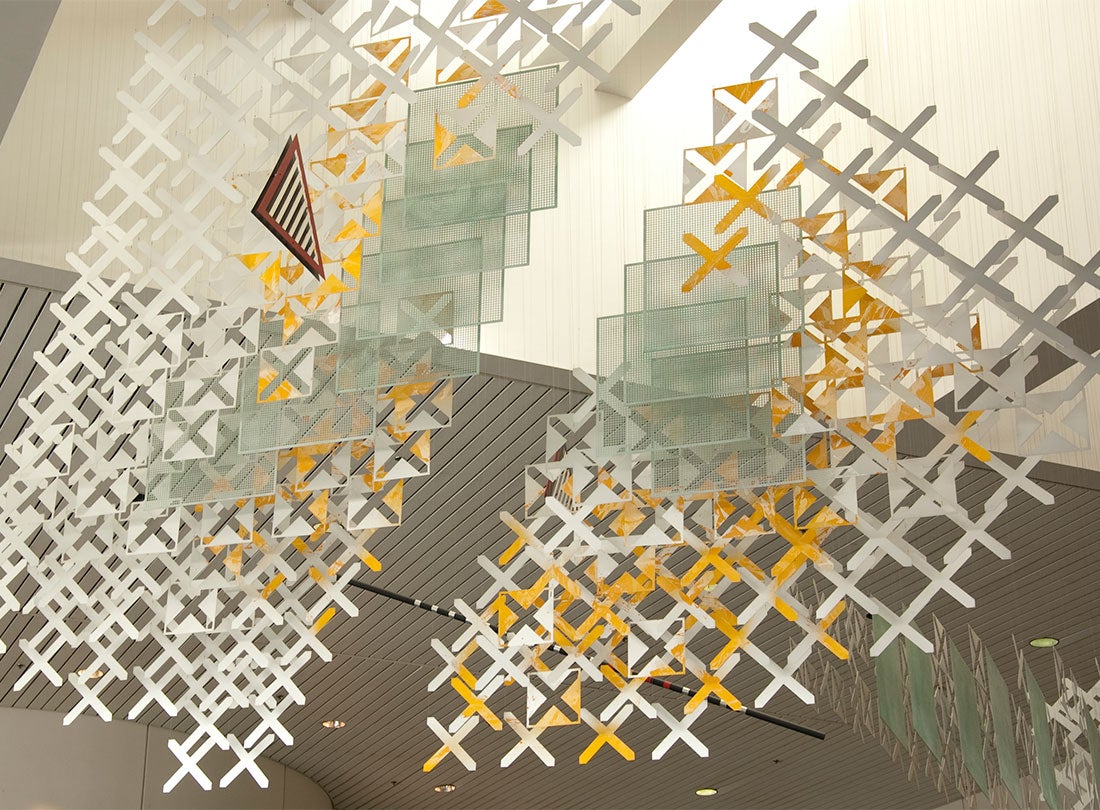 Larry Kirkland created large, aerial sculptures that are characterized by their nearly transparent, ethereal quality. This work was conceived by Kirkland after he spent time observing airport activities from an air traffic control room. Each of the 1500 elements suspended by 3000 wires represents an air traffic control symbol: triangles (landmarks), dotted lines (land boundaries), and x’s (flying objects).