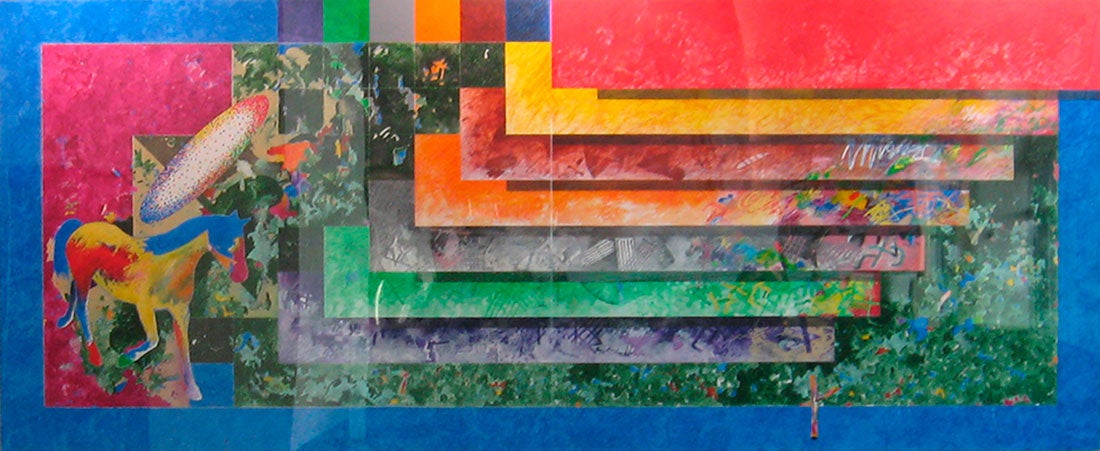 A flat, geometrical background is combined with representational imagery to create visual contradiction between the illusionistic spaces and the flat background surface. Robert Hudson, along with his childhood friend William T. Wiley, was a seminal figure in Bay Area Funk, a regional movement in the late 1950's and 1960's. Although perhaps best known for his sculptural assemblages, Hudson has also produced a large body of paintings and drawings during his distinguished career. With characteristic wit and irony, Hudson's canvases play with creating visual contradictions between three-dimensional illusion and flat, two-dimensional space.