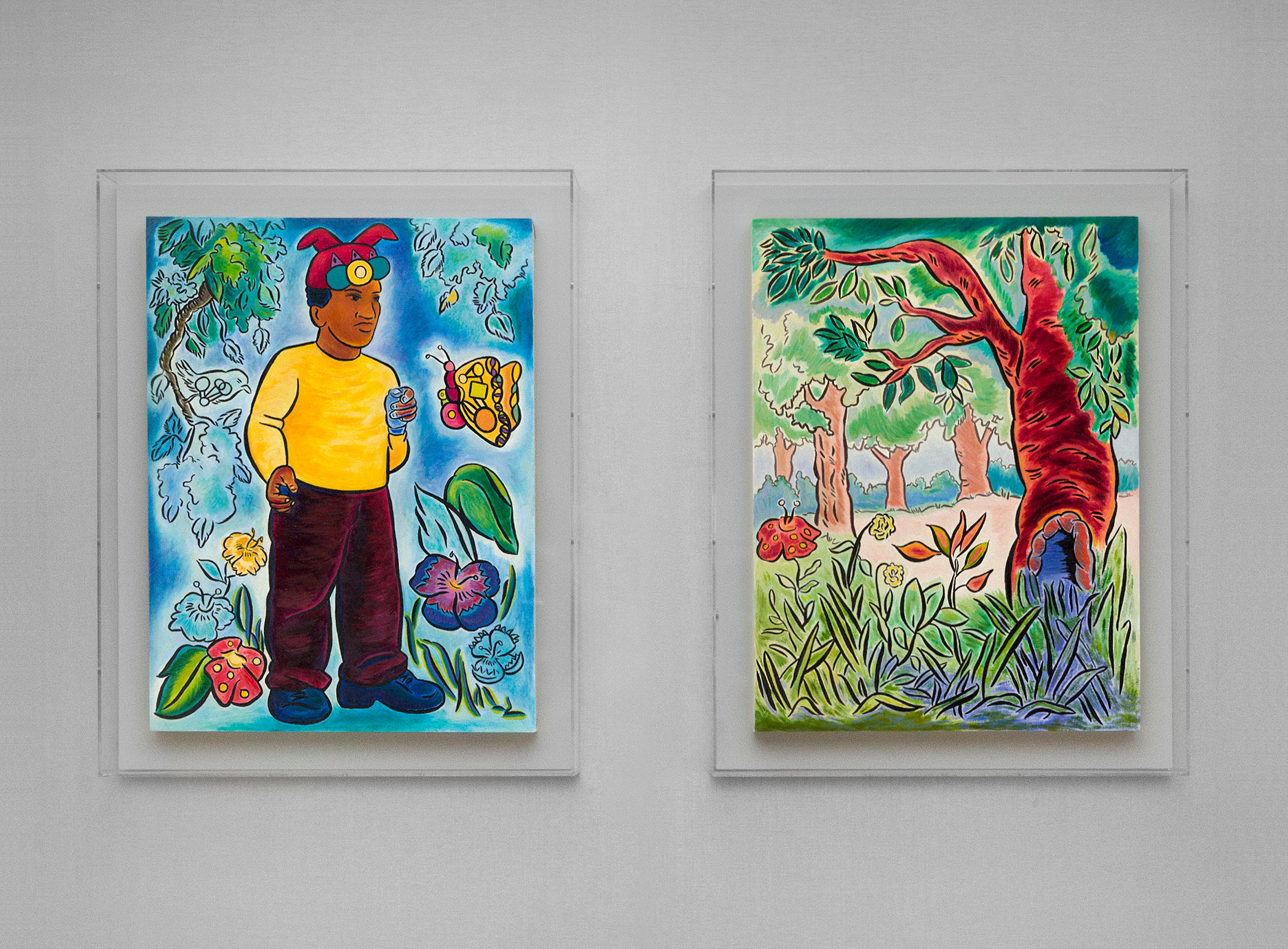 This painting by John Bankston is from the chapter "The Explorer," in his ongoing visual novel, The Capture and Escape of Mr. M or Tales from Rainbow Forest. Drawing on elements from science fiction, African American folktales, and gay culture, Bankston illustrates the story of Mr. M's journey through the Rainbow Forest, a place he describes as similar to San Francisco. Bankston utilizes the visual language of coloring books as an accessible entry point into his fantasy world. In separating individual works from the overall narrative, the artist intends for them to generate a new story on their own.