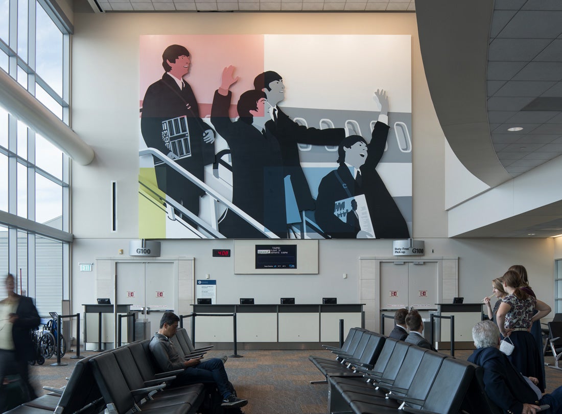 In this diorama-like construction, The Beatles are shown exiting an airplane on their first US tour in 1964. The colored rectangles superimposed onto this scene are based on Piet Mondrian’s Composition C (1935). By combining an archival image with an abstract composition, this work attempts to free the photograph of its documentary status while adding a narrative to a set of seemingly static primary color fields. Mondrian Meets The Beatles also imagines a meeting that never took place between a painter and music band, each of which revolutionized their respective fields of culture.