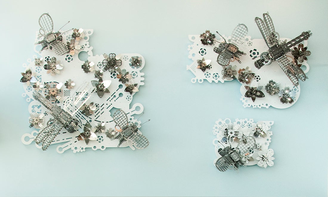 Joyce Hsu is a Bay Area artist best known for her mechanized creatures that inhabit a fantasy world of the artist’s creation. “Namoo” is a Korean word that implies nature. The title of this artwork suggests that the airport fuses science, nature, and imagination to become the transit home for all travelers. The graphic background is a stylized aerial view of SFO’s runways and terminals. The flowers and insects are reminiscent of model airplanes coming in for a landing.